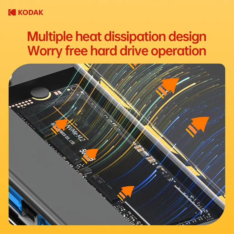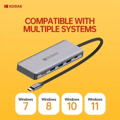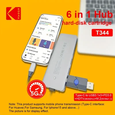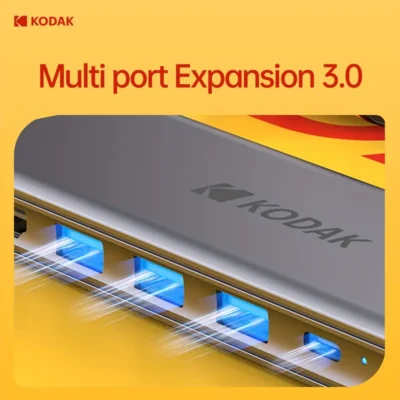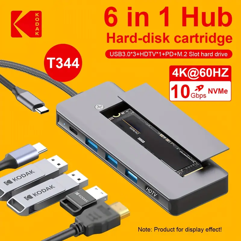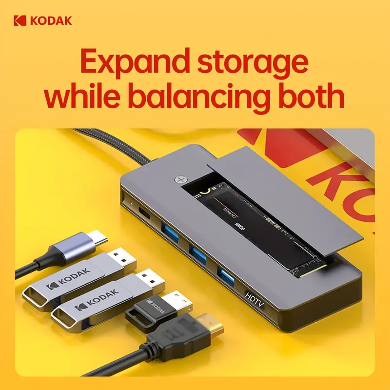 KODAK USB-C HUB 6-in-1&M.2 input port: Type-C 5V==3A(Max); output port: USB3.1*3+Type-C 3.0 Charge (PD3.0 100W) +HDTV(4K/60HZ) +M.2(NVME1.3)