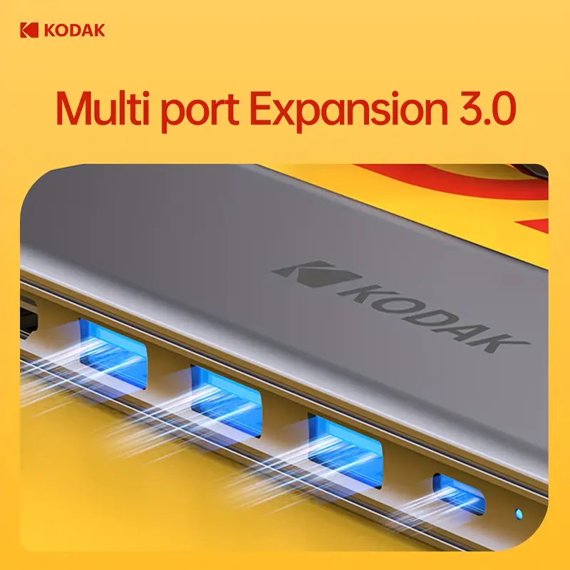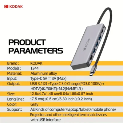 KODAK USB-C HUB 6-in-1&M.2 input port: Type-C 5V==3A(Max); output port: USB3.1*3+Type-C 3.0 Charge (PD3.0 100W) +HDTV(4K/60HZ) +M.2(NVME1.3); Support devices: All kinds of intelligent terminal equip., such as computer/laptop/tablet/mobile phone/PROJECTOR