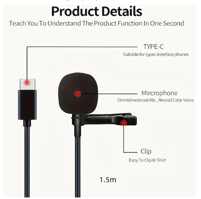 USB Type-C Clip-on Lapel Microphone with Condenser Mic