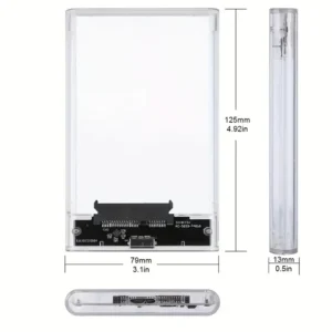 Features:1. Product Name: 2.5-inch USB 3.0 Micro to SATA HDD Enclosure2. Material: PC material3. Color: Transparent4. Supports all standard 7mm/9.5mm 2.5-inch SATA I/II/III HDDs and SSDs, Output:5. Tool-free installation; conflict interchange plug and play6. Product Indicator Light: Blue when powered on, flashes while reading or writing data7. Compatible Operating Systems: Windows 98 / 2000 / XP / Vista / 7 / 8 / 10, Linux, Mac OS 9.1 and above. 8. Up to 70% faster than traditional USB 3.0, using UASP transfer protocol; accelerates SSD hard drive read/write speeds9. JMS578 controller component. Fully transparent design. 10. Dimensions: 125*79*13mmPackaging: 1 x 2.5-inch hard drive enclosure, 1 x USB 3.0 cableNote: This product includes only the hard drive enclosure and data cable, excluding the actual hard drive